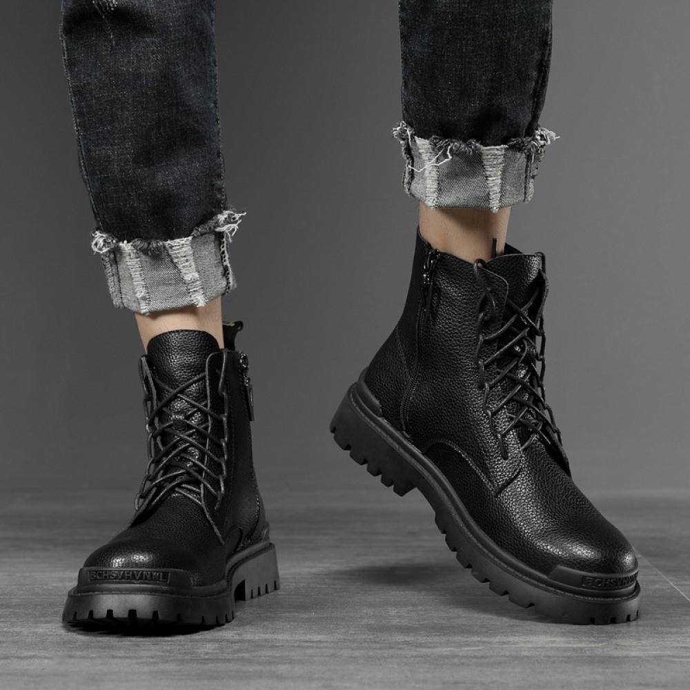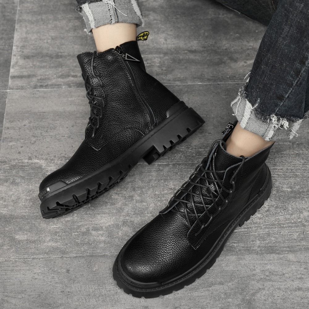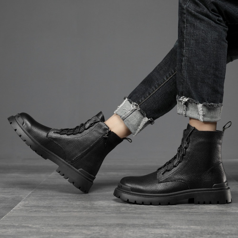 Men's Round Toe British Leather Boots Side Zipper Martin Boots Wear-Resistant Low-Heel Shoes
